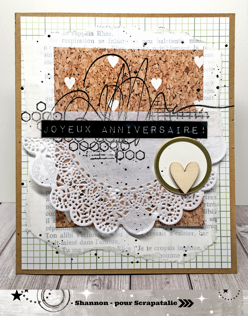 "Pour accompagner un cadeau scrappé, j'ai réalisé une petite carte pleine de douceur avec quelques chutes qui me restaient des kits précédents. Les touches de kraft, de faux liège, du doré et le cœur en bois, associé à un napperon et une feuille de livre gessoté surfent sur les textures."